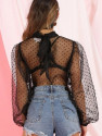 The top "Polkadot" is made of transparent fabric and decorated with fluffy dots. The top has a small stand-up collar that is tied in the neck with two 40 cm long strips of fabric. The sleeves are cut wide. There is an elastic waistband at the sleeve ends.